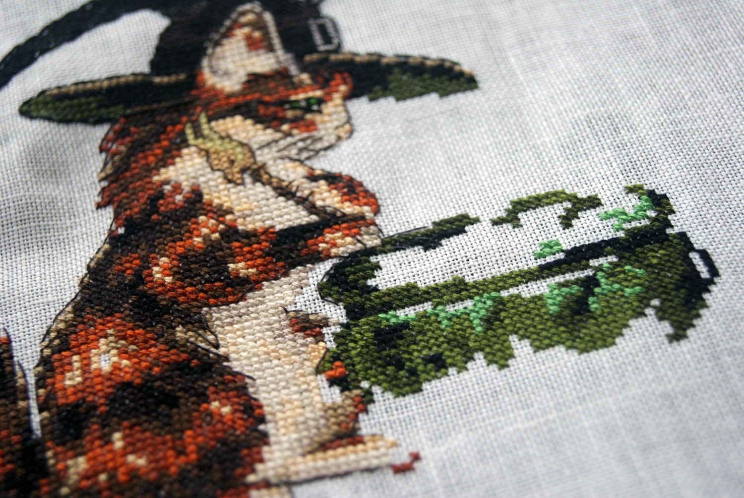 - Kot czarownik - kot jest już chyba cały, coraz więcej kociołka powstało. Przystopował mnie brak zielonej, metalizowanej muliny. Do tej pory zazwyczaj kupowałam muliny i kanwy stacjonarnie,